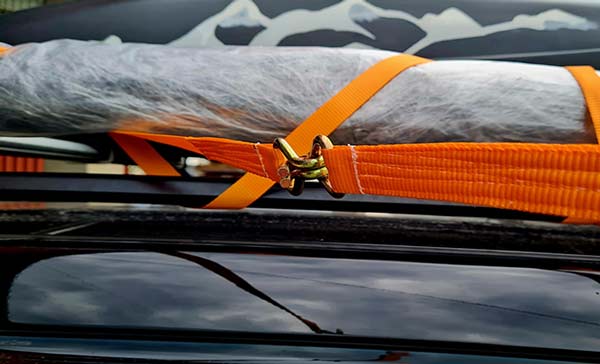 - Затяните стяжку вручную или при помощи храпового механизма. Натяжение должно быть достаточным для того, чтобы багаж не болтался, то есть, стоял (лежал) неподвижно. Важно выбрать усилие, чтобы не перетянуть, но одновременно надежно зафиксировать перевозимый предмет.
