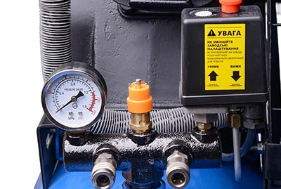 Компрессор оборудован реле давления для автоматического поддержания заданных параметров и двумя выходами для одновременного подключения нескольких потребителей. Контроль давления осуществляется с помощью установленного манометра.