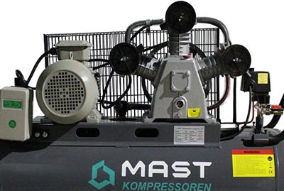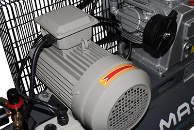 Установлен электродвигатель мощностью 3 кВт с медной обмоткой, рассчитанный на длительные рабочие циклы. Ременной привод снижает нагрузку на мотор и компрессорный блок, повышая общий ресурс оборудования. Запуск осуществляется через контактор, что повышает надёжность при эксплуатации.
