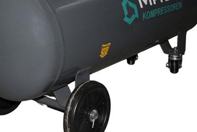 Несмотря на ресивер большого объема, модель сохраняет компактные габариты. Колеса и удобная компоновка позволяют легко перемещать компрессор по строй площадке и компактно хранить его на СТО.