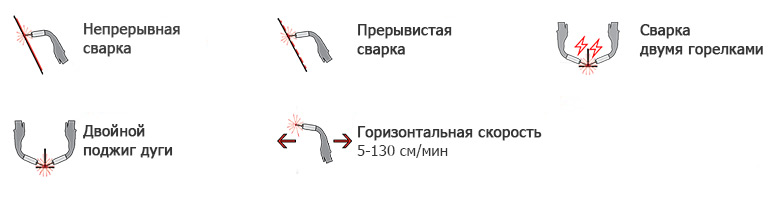 Режимы сварки: В прерывистом режиме длина сварного шва и промежутков задаётся в зависимости от пройденного расстояния. Оператор трактора может регулировать скорость сварки во время работы без необходимости менять заранее установленные параметры швов и пауз. Система управления автоматически пересчитывает длину шва и промежутков в реальном времени с учётом внесённых корректировок, обеспечивая точное выполнение программы.