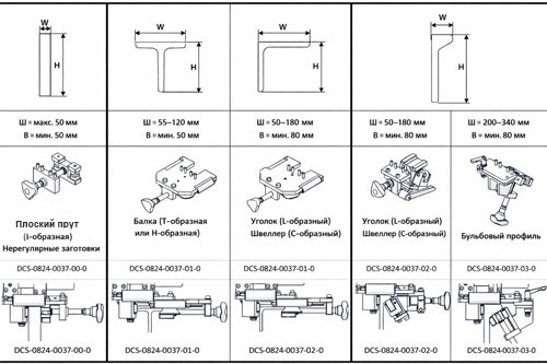 Для выполнения работ по необходимым типам профилей, есть 4 варианта зажимов на выбор. В зависимости от типа обрабатываемых стальных профилей. Дополнительные зажимы приобретаются отдельно. Они не входят в стандартный комплект поставки.