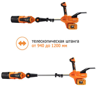 Конструкция модели предусматривает телескопическую штангу с регулировкой длины от 940 мм до 1.2 м. Такая система позволяет адаптировать инструмент под рост пользователя и облегчает уборку труднодоступных участков - вдоль заборов, под кустарниками и в местах со сложным рельефом.