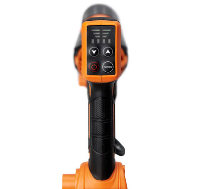 Основные элементы управления расположены на рукоятке воздуходувки. Пользователь может быстро выбирать рабочую скорость, активировать режим Turbo и контролировать уровень заряда аккумуляторов. Такое расположение органов управления позволяет изменять настройки без остановки работы.