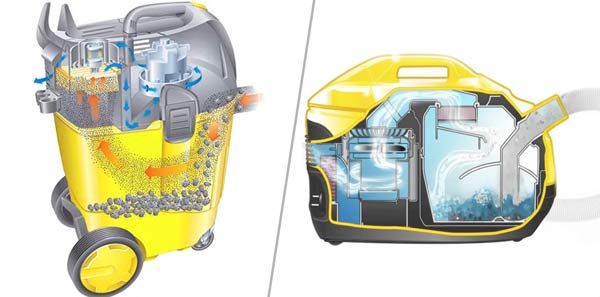 - Аквафильтр. Это наиболее технологичная система для фильтрации мусора в строительных пылесосах. Суть конструкции заключается в использовании водного слоя, через который проходит мусор, оседая на дне или поверхности (в зависимости от типа мусора). При этом мелкодисперсная пыль отфильтровывается в специальном сепараторе. Таким образом также получается многоступенчатая система очистки. Однако недостаток аквафильтров заключается в том, что они не предназначены для работы с крупным мусором. С их помощью можно избавляться от мелкой и средней пыли на строительной площадке или другом объекте.