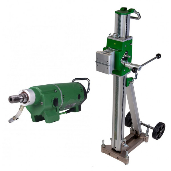 Мощный станок для сверления бетона больших диаметров – до 250мм. Многофункциональный и эффективный, пользующийся высокой популярностью в среде профессионалов. Мощность двигателя составляет 2400Вт, а количество скоростных режимов – 2 (на 185/450 оборотов в минуту). Идет в комплекте с телескопической стойкой 100 см, станина может вращаться на 360 градусов. Сохраняют высокую производительность в течение длительного периода. Принадлежности от скандинавского бренда Хускварна (Швеция) включены в число лучших в мире. Отдельного внимания заслуживает инновационная система безопасности, защита сводит риски поломки, неисправностей фактически до нуля. Поддерживает обе технологии бурения – сухой и мокрый. Весит сравнительно немного – 25 килограмм. Дополнительный бонус – демократичная цена.
