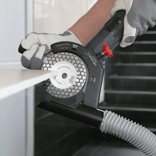 У такого метода как затирать углы плитки есть нюанс — во время обработки образуется большое количество пыли. Поэтому без вспомогательных устройств работать неудобно. Например, система TileDuster от компании Mechanic помогает собирать пыль и делает процесс чище и безопаснее.