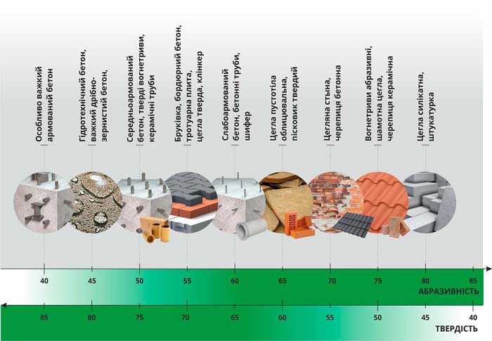 Дуже важливо правильно оцінити оброблюваність матеріалу, з яким належить працювати. Дана характеристика відображає, наскільки легко та швидко алмазний диск прорізає ту чи іншу конструкцію. Основними показниками є твердість та абразивність, які зазвичай обернено пропорційні один одному. Чим нижча абразивність, тим щільніший і твердіший матеріал, і тим складніше його розрізати, і навпаки.