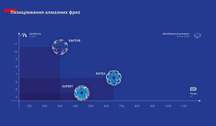 Це дані під час роботи з бетоном марки М250. Як бачимо, сама швидкісна насадка має і найменший ресурс.