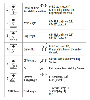 - OFF (за замовчуванням, LED вимкнений): джерело зварювання знижує струм дуги при заповненні кратера. Час заповнення кратера повинен бути більше або дорівнювати часу зниження струму джерела.